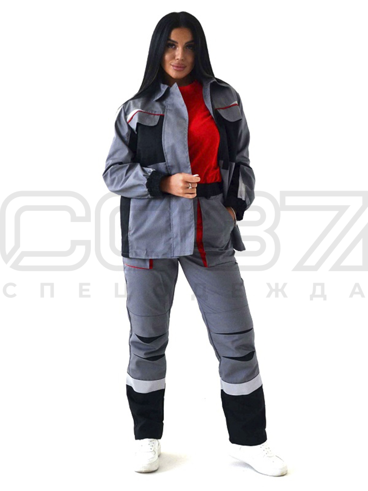 Костюм рабочий женский "Кейп" с СОП цв.серый/чёрный/красный тк.смесовая (куртка+брюки) в Туле